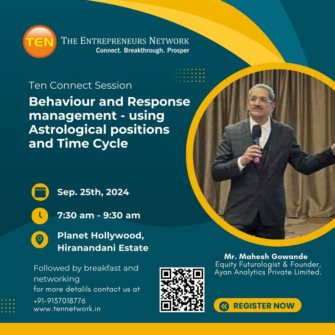 Dear Business Owners, Join us on 25th Sept 2024 for an interesting session on Behaviour and Response management – using Astrological positions and Time Cycle by by Mr. Mahesh Gowande, Equity Futorologist and Founder of Ayan Analytics Pvt Ltd.